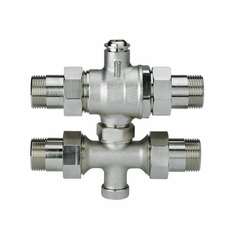 4-Wege Kugelhahn, AG/Übw-Mutter, mit Steckverbindung für Stellantriebe, MS-vernickelt.