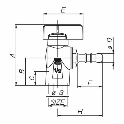 | G0320N34 | Gas-Kugelhahn, Eckausführung, IG/Schlauchtülle ID 10mm, Plastik-Drehgriff, Messing vernickelt. - 1/2" - ISO |