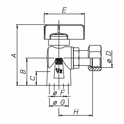 | G0324N35 | Gas-Kugelhahn, Eckausführung, red. Durchgang, IG/IG, Übw-Mutter, PlastikDrehgriff, Messing vernickelt. - 1/2" X 1/2" - ISO |