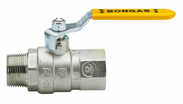 Gas-Kugelhahn, mittelschwere Ausführung, red. Durchgang, AG/IG, Stahl-Hebelgriff (Vinyl isoliert), Messing vernickelt.