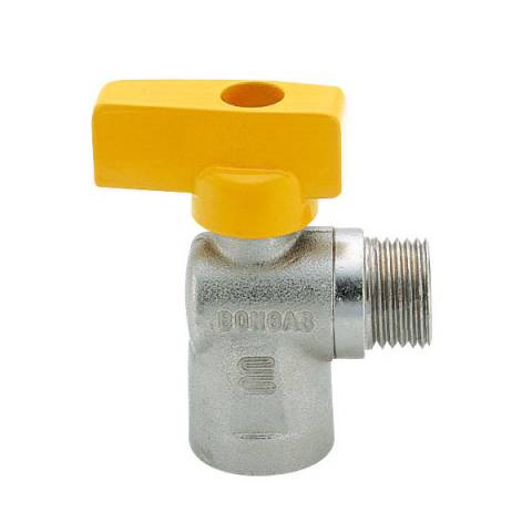 Gas -Kugelhahn, Eckaus führung, red. Durchgang, IG/AG, Plastik- Drehgriff, Messing vernickelt.