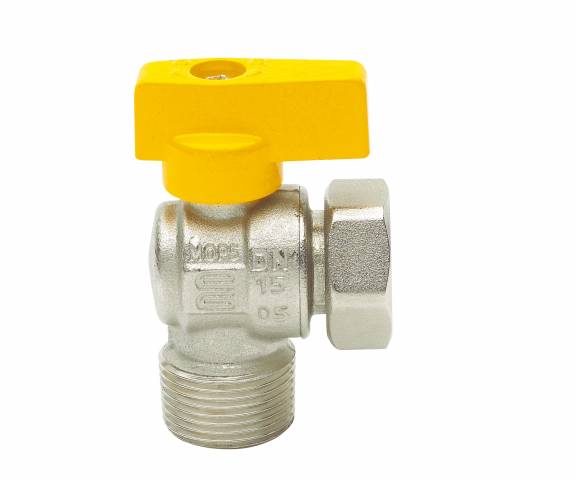 | G0386N04 | Gas-Kugelhahn , Eckausführung, AG/IG Übw.-Mutter, Plastik-Drehgriff, Messing vernickelt. - 1/2" X 1/2" - ISO |