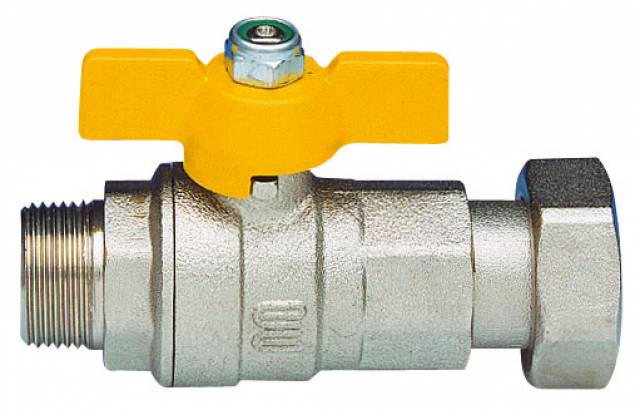 Gas-Kugelhahn, schwere Ausführung, voller Durchgang, AG/IG, Übw-Mutter, Alu- Flügelgriff, Messing vernickelt.