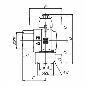 | S0286N35 | Gas-Kugelhahn, Eckausführung, IG/IG, Alu-Flügelgriff, Messing vernickelt. - 3/4" X 3/4" - ISO |