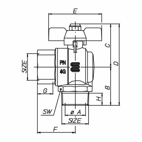 | S0288N35 | Gas-Kugelhahn, Eckausführung, IG/AG, Alu-Flügelgriff, Messing vernickelt. - 3/4" X 3/4" - ISO |