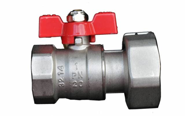 Messingkugelhahn kompakt, 1“ IG und unlösbarer 1 1/4“ Überwurfmutter, Alu-Flügelgriff rot