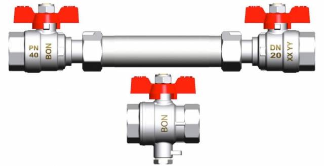 Wärmemengenzähler Einbauset , Alu-Flügelgriffe rot/, horizontal, Kugelhähne aus Messing mit unlösbarer Überwurfmutter, PN40