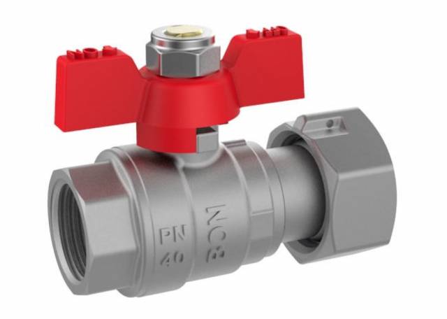 BON-Kugelhahn IG/ÜM, aus Messing CW617N, FKM-O-Ringe an der Spindel mit unlösbarer Überwurfmutter, Alu-Flügelgriff rot lackiert