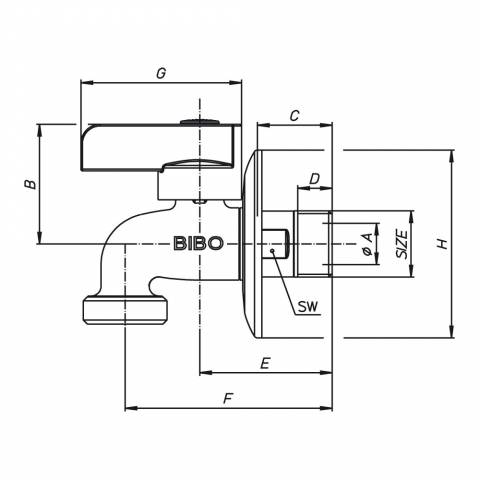 | S0121C04 | Kugelauslaufhahn AG/AG, mit Rosette und SW zur Wandbefestigung, Drehgriff aus ABS verchromt, Messing vernickelt. - 1/2" - ISO |
