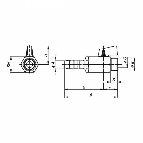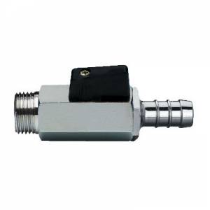 | S0313C02 | Kugelhahn, AG/Schlauchanschluss, einteiliges 6-Kant-Gehäuse aus Messing verchromt, Plastik-Hebelgriff. - 1/4" - ISO |