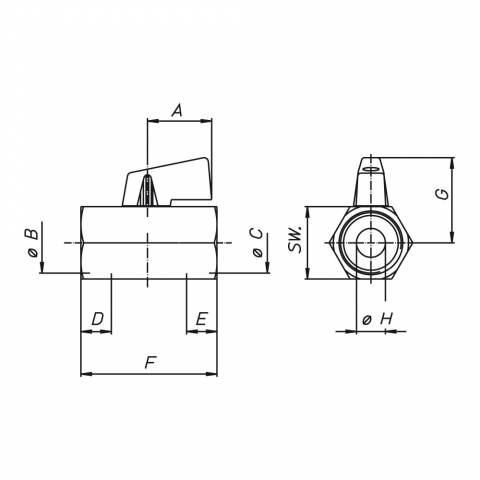 | S0330C01 | Kugelhahn, IG/IG, einteiliges 6-Kant-Gehäuse, Plastik-Hebelgriff schwarz, Messing verchromt. - 1/8" - ISO |