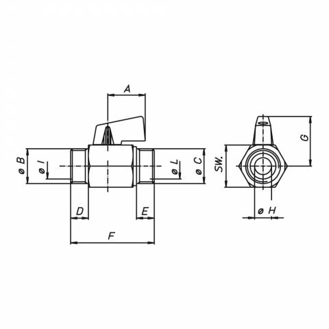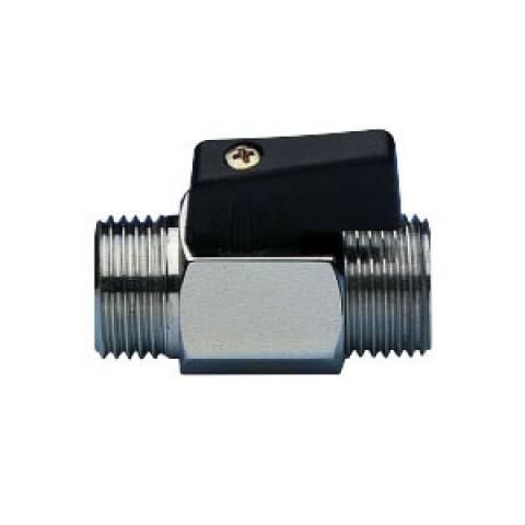 | S0332C02 | Kugelhahn, AG/AG, einteiliges 6-Kant- Gehäuse, Plastik-Hebelgriff schwarz, Messing verchromt. - 1/4" x 8 - ISO |
