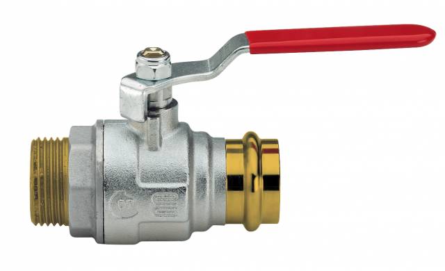 Kugelhahn, mittelschwere Ausführung, voller Durchgang, AG/Pressverbinder, Stahl-Hebelgriff (Vinyl isoliert), Messing vernickelt.
