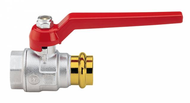 Kugelhahn, mittelschwere Ausführung, voller Durchgang, IG/Pressverbinder, Alu- Hebelgriff , Messing vernickelt.