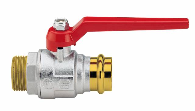 Kugelhahn, mittelschwere Ausführung, voller Durchgang, AG/Pressverbinder, Alu- Hebelgriff, Messing vernickelt.