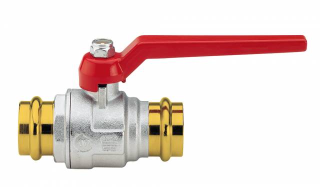 Kugelhahn, mittelschwere Ausführung, voller Durchgang, Pressverbinder /Pressverbinder, Alu -Hebelgriff, Messing vernickelt.