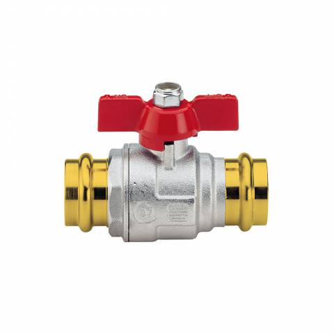 Kugelhahn, mittelschwere Ausführung, voller Durchgang, Pressverbinder /Pressverbinder, Flügelgriff, Messing vernickelt.