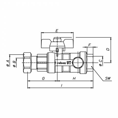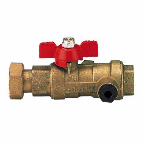 Das ROBEX-VT-Dreifachventil ist eine Kombination aus dem Kugelhahn OMEGA, schwere Serie mit vollem Durchgang, dem Rückschlagventil VALSTOP, schwere Serie mit vollem Durchgang mit minimalem Druckverlust, und zwei seitlichen Wasserfassungen, eine oberhalb und eine unterhalb des Rückschlags.