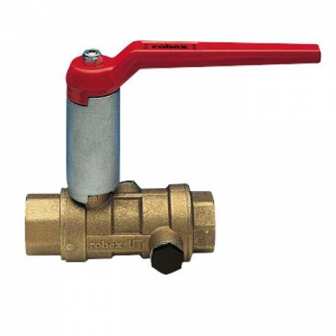 Kugelhahn mit integr. Rückschlagventil mit Entleerung und Manometeranschluß, IG/IG, mit hochgesetzter Alu-Hebelgriff, Messing blank.